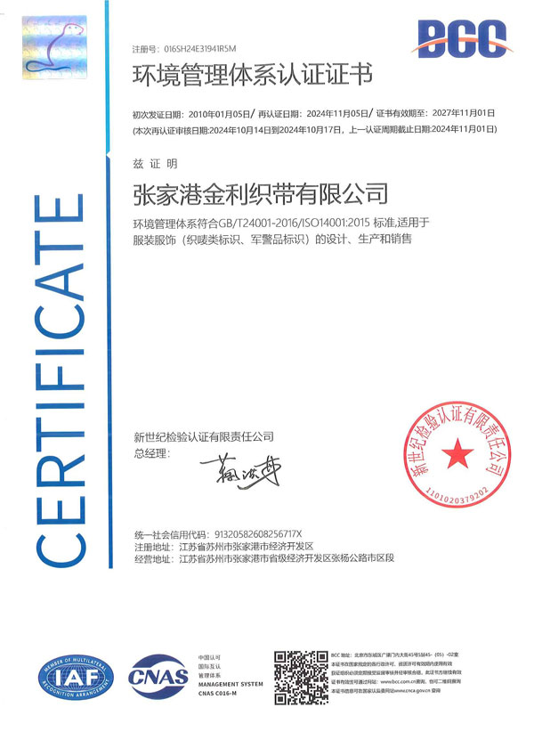 环境管理体系认证证书