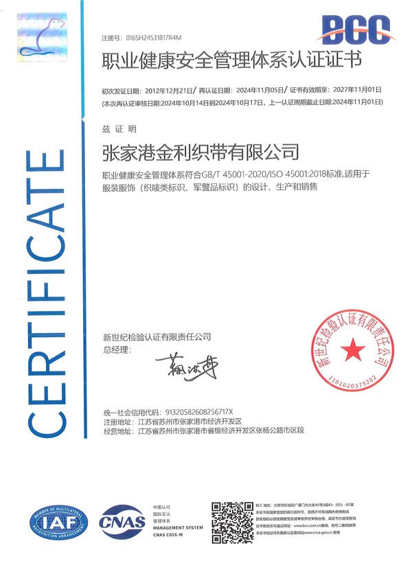职业健康安全管理体系认证证书