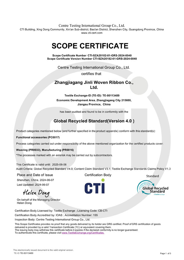 全球回收标准(GRS)认证证书